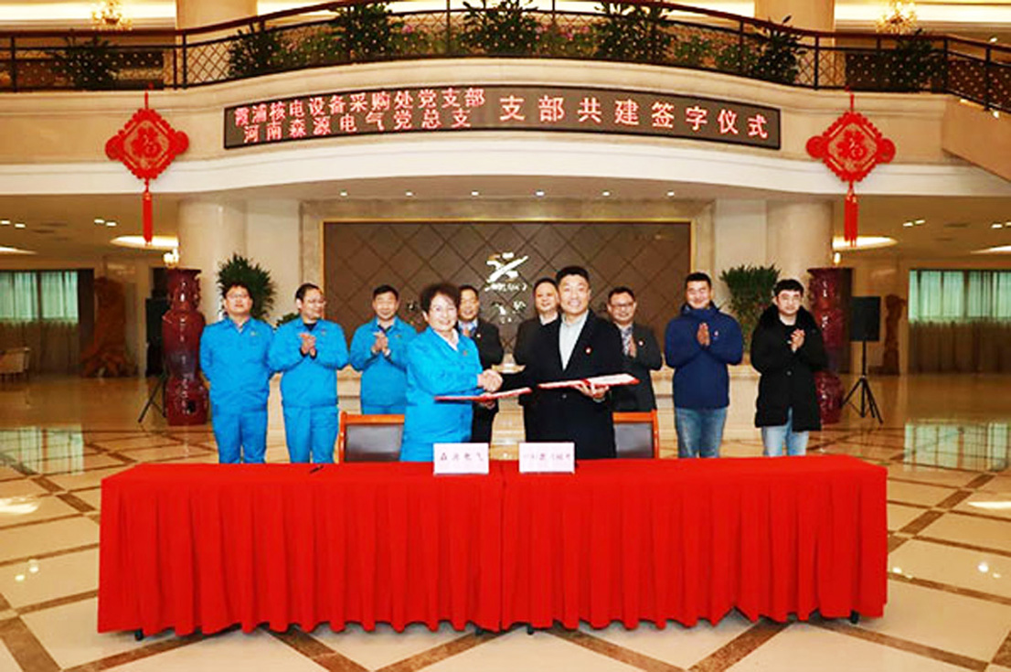 郑砚国对森源依靠党建促发展所取得的成就和“五融”党建工作法表示高度赞赏,并介绍了霞浦核电项目建设进展情况。双方还决定在中核霞浦核电设备采购处党支部和河南森源电气股份有限公司党总支开展支部共建工作,并成立联合党员突击队。郑砚国向森源电气总经理助理、成套设备分公司总工程师、核电办公室主任崔晓科授予队旗,中核霞浦核电有限公司设备采购处副处长孙志刚、森源电气党总支副书记张瑜霞分别代表双方在支部共建协议上签字。