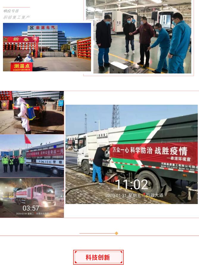 面对新冠肺炎疫情,森源集团成立疫情防控专项工作领导小组,研究制定了疫情防控具体措施:从应急防疫车辆和物资装备的生产支援,到环卫工作的保质保量;从城乡全区域的消毒杀菌,到响应号召积极复工复产……森源竭尽所能为疫情防控贡献着力量。