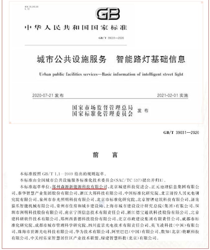10月份,由郑州森源新能源作为第一起草单位的国家标准《城市公共设施服务 智能路灯基础信息》,获得了国家市场监督管理总局、国家标准化管理委员会批准。