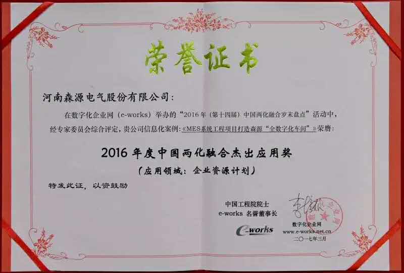 阳春三月,草长莺飞,正是万物生长的好时节。近期,在北京举行的2017中国信息化和工业化融合发展高峰论,将主题确定为“互联网与工业的深度融合之道”。森源集团旗下森源电气传来喜讯,“森源全数字化车间MES工程项目”、森源电气总经理曹宏和副总工程师、信息中心主任顾总理在2016年度“中国两化融合岁末盘点”评选活动中分别荣膺“2016年度中国两化融合杰出应用奖”、“2016年度中国推进两化融合杰出CEO”和“2016年度中国制造业杰出CIO”。