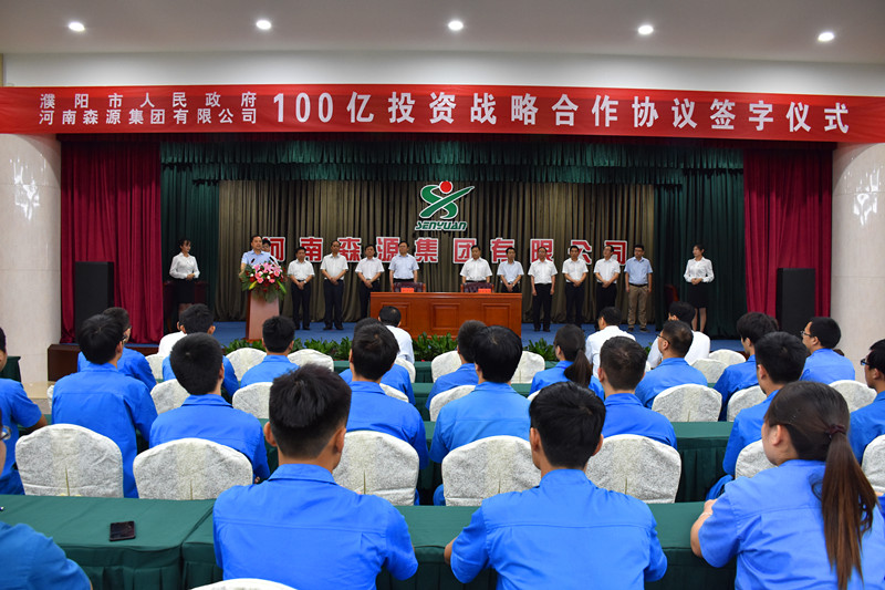 濮阳市委书记何雄,濮阳市委常委、常务副市长李刚,濮阳市政府副市长徐慧前,濮阳市发改委主任张相坤,濮阳市工信委主任薛炳海,华龙区委书记刘洪浩,台前县县长王俊海,森源集团董事局主席、总裁楚金甫,集团领导曹宏、陈西山、杨宏钊、姚景涛、楚光辉等出席签约仪式。濮阳市政府副市长徐慧前与河南森源集团副总裁杨宏钊分别代表甲乙双方,在协议书上签字。多家媒体见证了森源集团与濮阳市政府共话促发展这一激动人心的时刻。