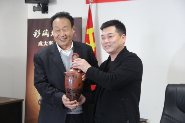 会议最后,河南仰韶营销有限公司总经理助理、天宝中心总监郝惠峰向新蒲建设集团有限公司赠送了仰韶彩陶坊天时珍藏酒。