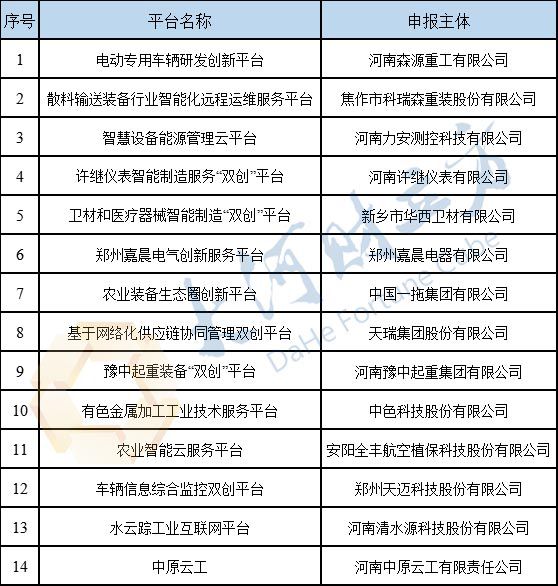 根据专家意见,经研究,拟确定河南森源重工有限公司——电动专用车辆研发创新平台等14个平台为2018年河南省制造业“双创”平台;郑州宇通集团有限公司——宇通制造业与互联网融合“双创”示范基地等5个基地为2018年河南省制造业与互联网融合“双创”基地。公示时间为2018年10月17日至2018年10月23日。