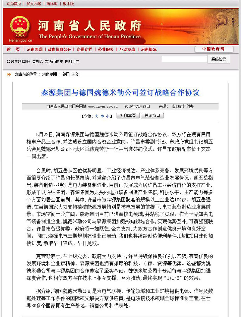 河南省人民政府门户网站河南要闻——森源集团与德国魏德米勒公司签订战略合作协议 发布日期: 2016-05-28 分享 加入收藏 5月27日,河南省人民政府门户网站河南要闻栏目发布新闻《森源集团与德国魏德米勒公司签订战略合作协议》。 原文链接:http://www.henan.gov.cn/jrhn/system/2016/05/27/010644282.shtml 上一条 许昌电视台对森源集团与德国魏德米勒公司签订战略合作协议进行特别报道 2016-05-24 下一条 许昌日报/许昌市人民政府门户网站/许昌电视台——我市第一个山地林光互补光伏发电项目并网发电 李建民出席并网发电仪式 2016-05-31