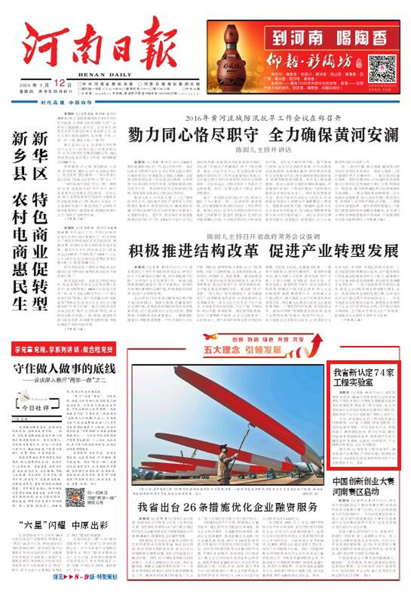 河南日报头版报道——我省新认定河南森源电气股份有限公司智能互联输配电装备及系统集成等74家省工程实验室